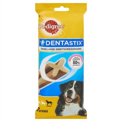 De DentaStix van Pedigree is een smakelijke kauwsnack die bijdraagt aan het verminderen van tandplak en tandsteen. De speciale structuur van de DentaStix buigt om de tanden heen, waardoor het bijdraagt aan een grondige reiniging van het gebit!